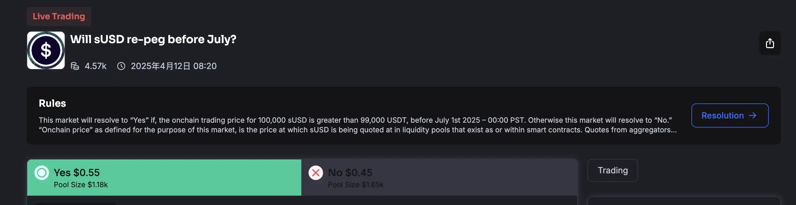 预测市场 Truemarket 已上线了关于 sUSD 能否在七月之前回锚的预测池,当前 Yes 份额的报价为 0.55 美元,No 份额的报价为 0.45 美元。