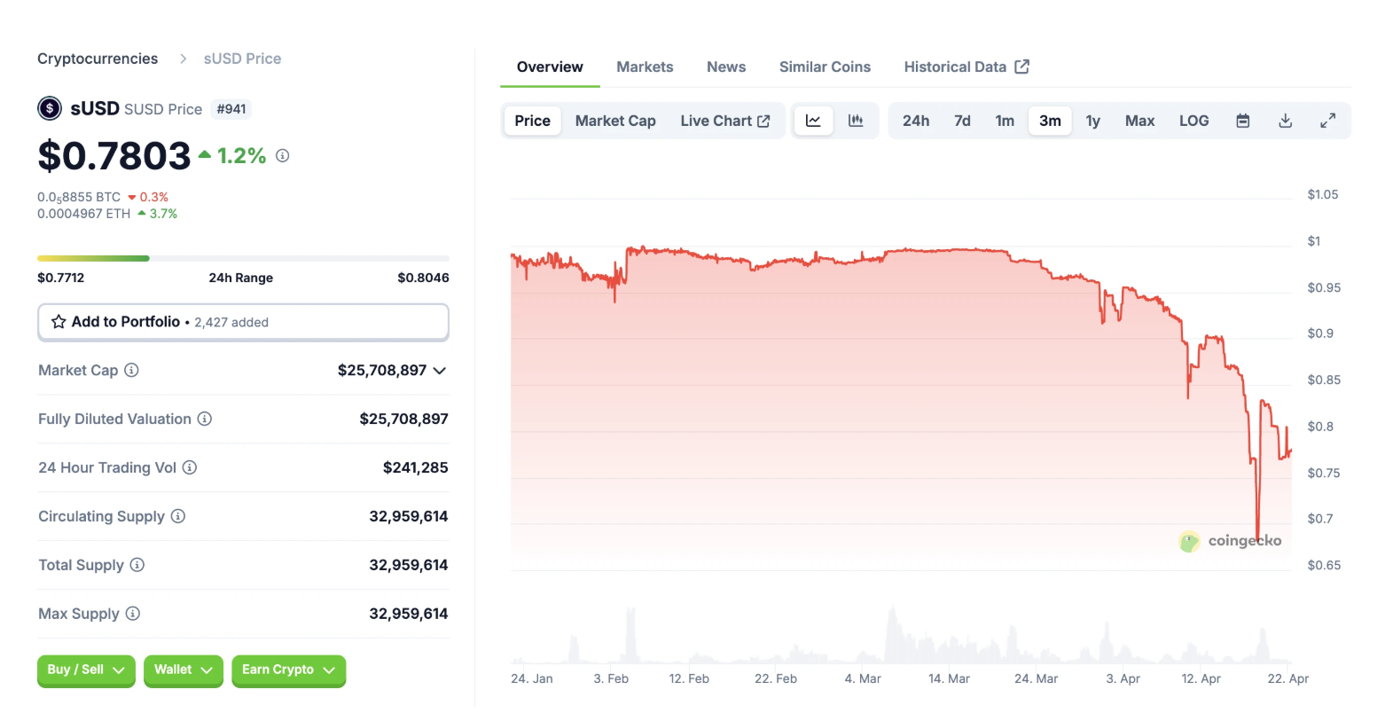 Synthetix 旗下稳定币 sUSD 近期因长时间脱锚而备受市场关注。