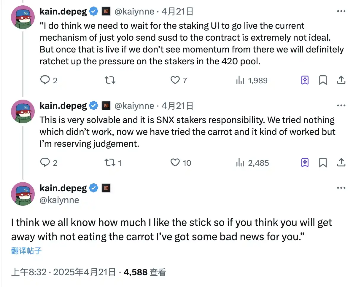值得一提的是,Kain 还提到如果 SNX 质押者不采用新推出的质押机制来帮助解决 sUSD(SUSD)脱锚问题,将会对他们施以「大棒」——或暗示在多项激励措施后,接下来将通过惩罚条件来对仍不「配合」修复行动的用户进行施压。