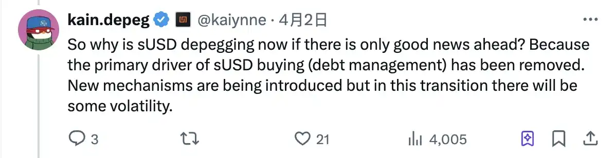 4 月 2 日,Synthetix 创始人 Kain 首次发文回应了 sUSD 的脱锚。Kain 提到,脱锚是因为购买 sUSD 的主要驱动因素(债务管理)已被消除,而新机制正在过渡中,因此出现了短暂脱锚。