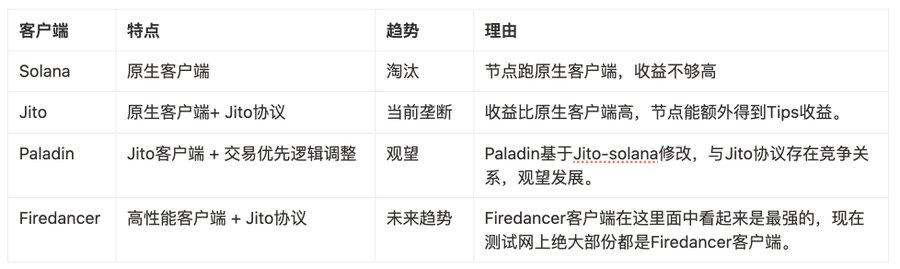 · Solana 节点这是最基础的节点客户端,不包含任何 MEV 优化机制,运行该客户端的节点几乎已被边缘化,因收益远低于运行 Jito 的节点。