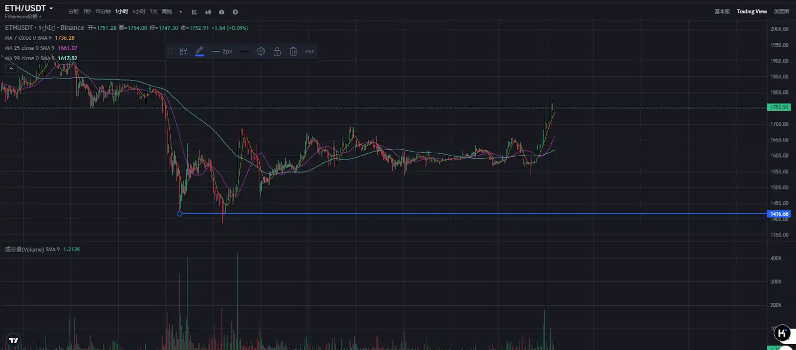 2025 年 4 月 223 日,以太坊(ETH)上演了一场惊心动魄的价值回归大戏。其价格从 4 月 6 日的年度低点 1385 美元一路攀升,至 4 月 23 日突破 1750 美元关口,两周内累计涨幅达 26.3%,单日最高涨幅超过 10%。Coinglass 数据显示过去 24 小时,以太坊爆仓金额超 1.2 亿美元。