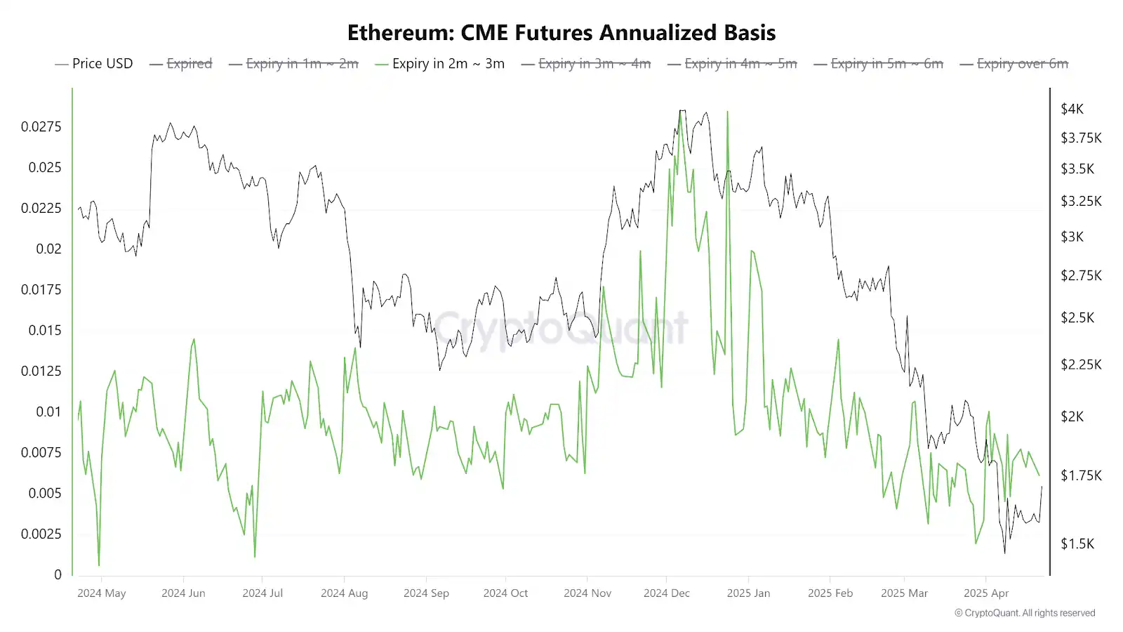 这一过程中,芝加哥商品交易平台(CME)的 ETH 基差从 2024 年 11 月的 20% 骤降至 2025 年 4 月的 5%,标志着套利资本主导的做空动能衰竭,为价格反弹扫清障碍。