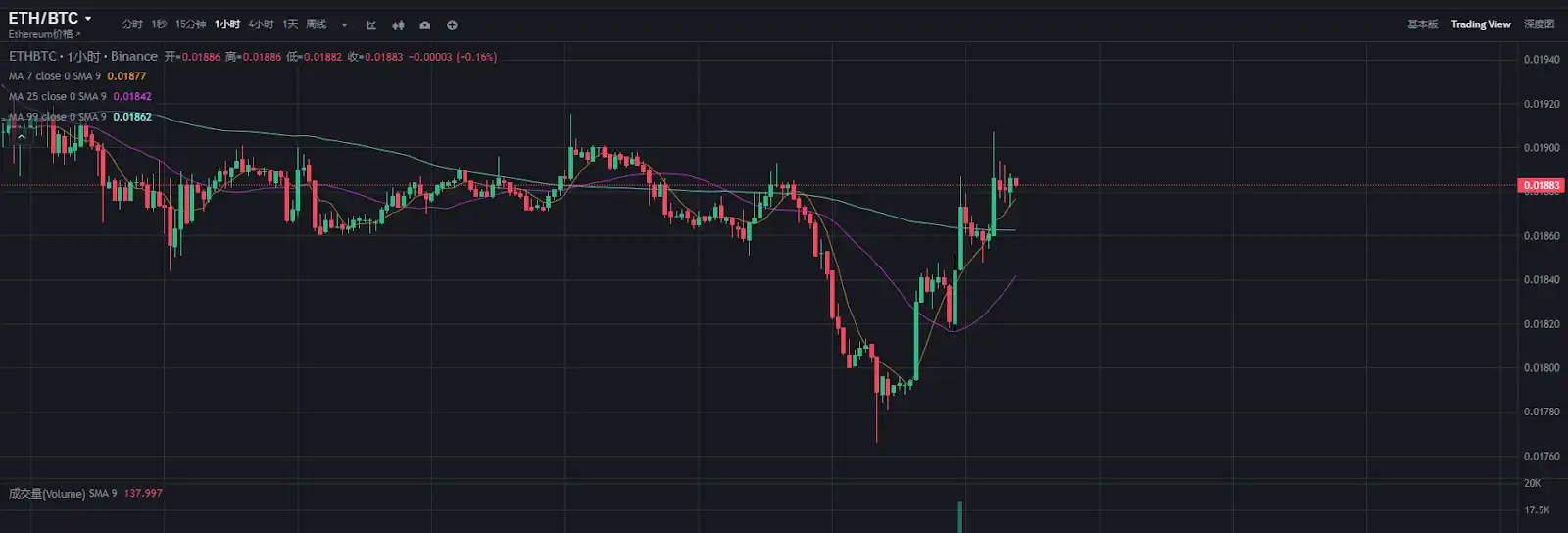 ETH/BTC 汇率从历史低点 0.01765 反弹至 0.0191,显示出市场对以太坊生态的信心修复。