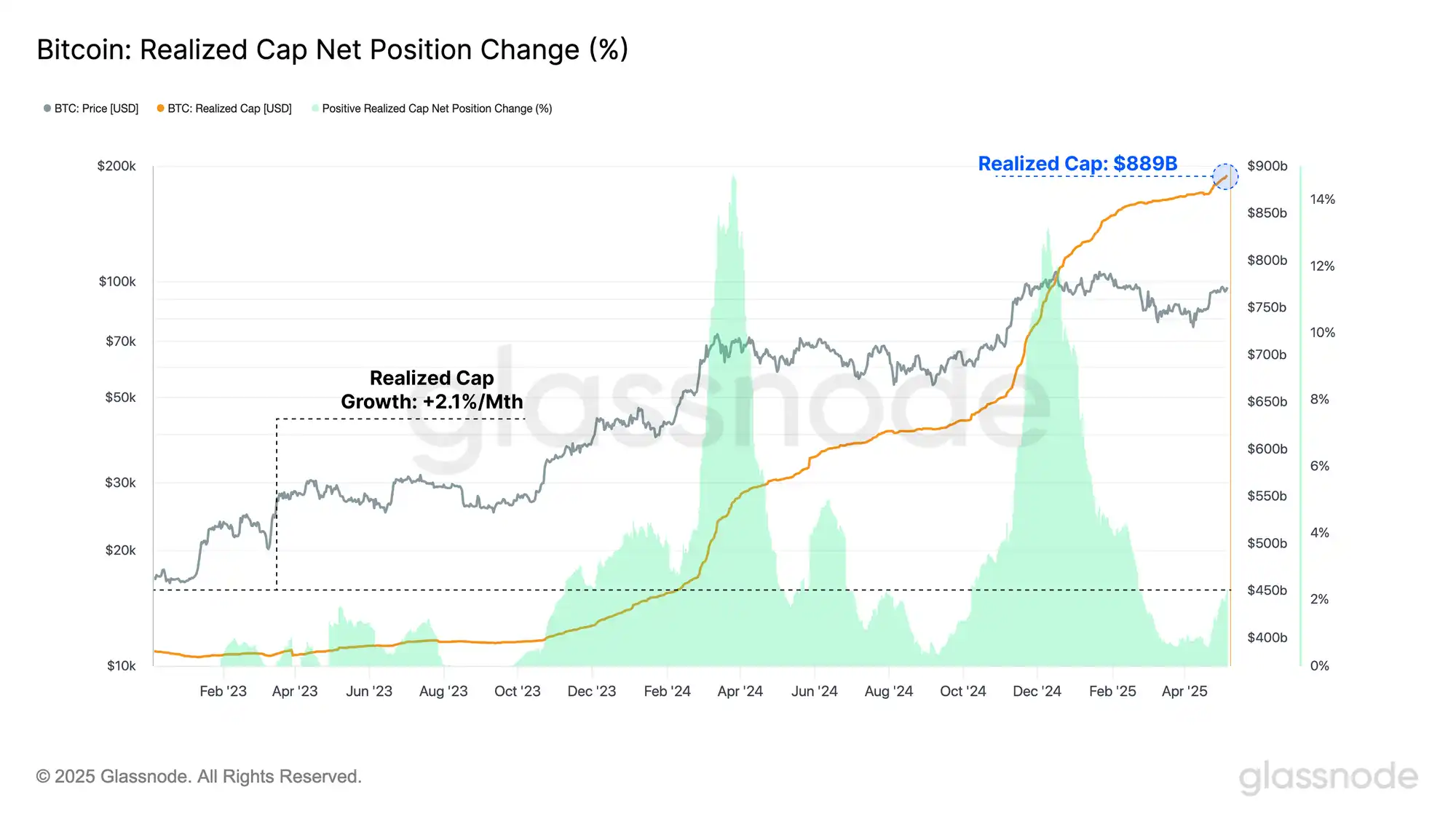 首先,比特币的实现资本(Realized Cap)攀升至 8890 亿美元的历史新高,过去一个月增长 2.1%。这一指标衡量了累计净资本流入,反映出资金注入的强劲势头。净实现利润/损失指标进一步显示,近几周每日净资本流入超过 10 亿美元,表明买家愿意以当前价格吸纳卖单,需求旺盛。相比之下,实现亏损仅占总交易量的 1-2%,暗示大部分高位买入的投资者仍在持币观望,市场情绪偏向乐观。