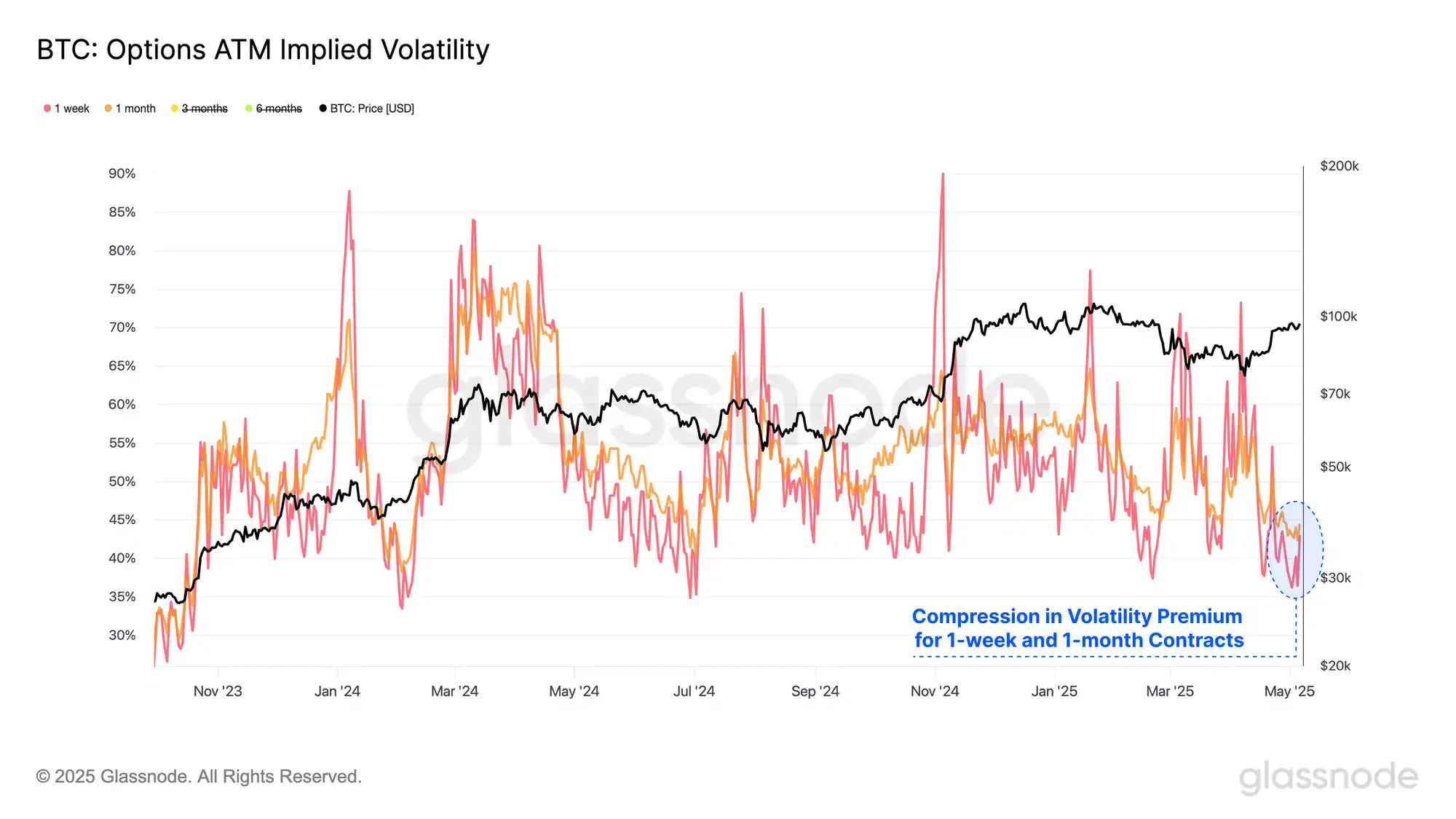 最后,期权市场提供了波动性的外部视角。1 周和 1 个月的 ATM 隐含波动率跌至 2024 年 7 月以来最低,反映出投资者对未来波动的低估。历史上,低波动率往往预示着高波动期的到来,结合链上供给密度的高企,市场可能正酝酿一场风暴。