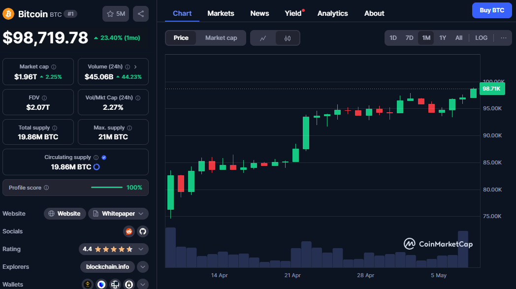 2025 年 5 月,比特币(BTC)价格如一匹脱缰野马,一度冲刺至 97,900 美元的近两个月高点,随后在 94,000 美元附近短暂喘息,又迅速回升至 97,000 美元左右。这场价格狂欢点燃了加密市场的激情,也让投资者开始追问:是什么在推动这波涨势?是特朗普高调的贸易宣言,还是美联储的货币政策风向?抑或是华尔街巨头对加密资产的加速拥抱?答案或许是三者的交织。这篇文章将以叙事的方式,娓娓道来,梳理近期消息面如何点燃比特币的火花,深入剖析链上数据的细腻脉动,展望市场的机遇与隐忧,力求既引人入胜又不失专业深度。