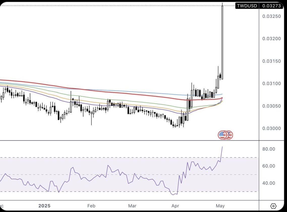 与此同时,新台币(TWD)兑美元在两天内暴涨逾 8%,这是极为罕见的「19 西格玛」事件。这一突如其来的走势,源于台湾本地机构快速调整仓位、减少对美元的敞口,凸显了市场对地缘政治风险的担忧加剧,也生动反映出中美紧张关系加剧对全球外汇市场的直接影响。