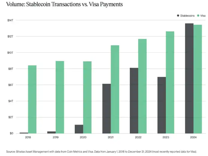 在地缘紧张和金融不确定性加剧的时代,这种「交易自主权」的需求极具吸引力。2024 年,稳定币的交易量已经超过了 Visa。归根结底,运行在加密网络上的数字美元(稳定币),正在重建 20 世纪的离岸美元体系——为那些对美国霸权心存顾虑的市场,提供绕开美国银行系统的美元流动性。
