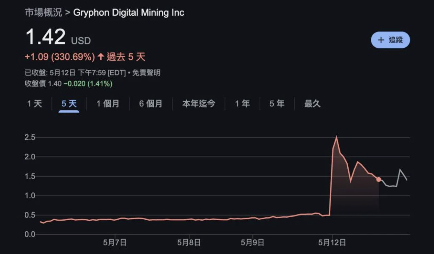 受合并消息影响,Gryphon Digital Mining 的股价在 5 月 12 日盘前交易中飙涨约 280%,截至撰稿时,GRYP 已从 5 月 9 日的 0.52 美元上涨至 1.42 美元,近 5 日涨幅高达 330%。
