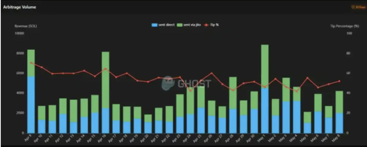 目前,Solana 上大约 50% 的套利 MEV 都是通过 Jito 进行的(该价值通过小费路由器与质押者共享):