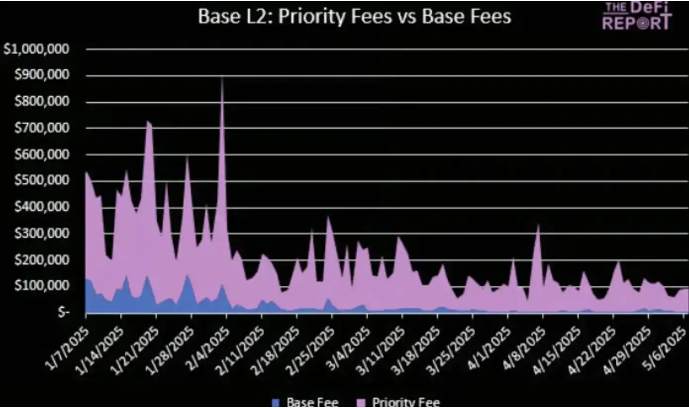 以太坊面临的最大未知数是如果大部分交易都如预期那样转移到 L2,MEV 会怎样?我们认为 MEV 将已优先手续费的形式转移到 L2。下图显示,Base 85% 的手续费来自优先手续费。