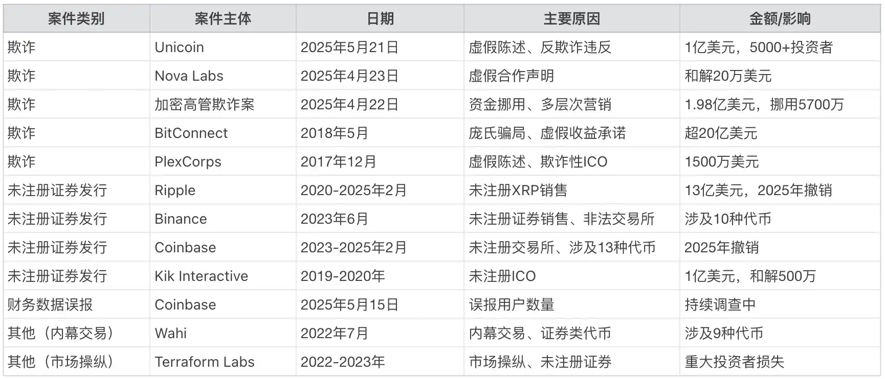 最后,法律争议有所减少。Ripple 案中,法院对 XRP 的证券属性作出分裂裁定,凸显了 Howey 测试的局限性。而 Unicoin 案等新诉讼主要基于欺诈和未注册销售,法律争议较少,避免了定义代币属性的复杂性。这种精准执法有助于减少行业的不确定性。随着明确规则的出台,未来可能出现更多私人证券诉讼和集体诉讼,而 SEC 的执法资源将更聚焦于传统欺诈和庞氏骗局。