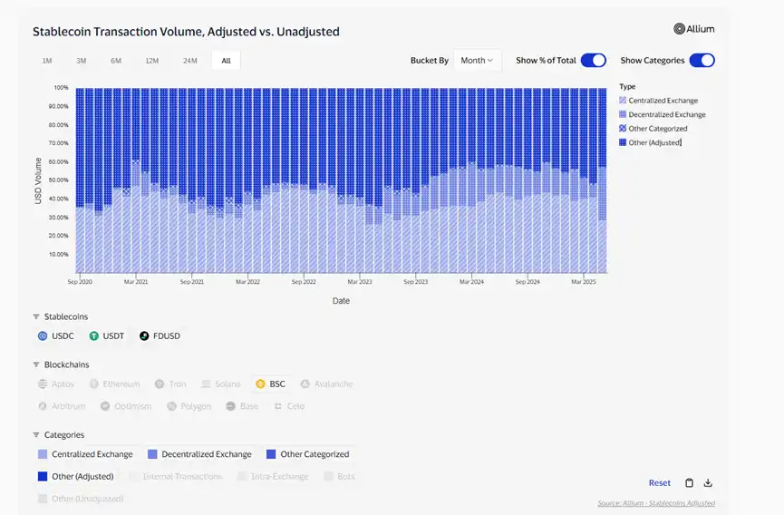 而 BSC 此前主推的 BUSD 和 FUSD 的占比则下降至合计 3% 左右。USDT 的发行量占比则约为 59%,USD1 占比约为 21%。Visa Onchain Analytics 数据显示,随着近期 Binance 钱包的热度提升,BSC 链上的稳定币 DEX 交易占比从 4 月的不到 10% 提升至 28%,与中心化交易平台占比几乎相同。