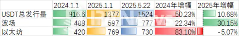 增长趋势上: 波场上的 USDT 供应量从 2024 年的 488 亿美元增长到 597 亿美元。2025 年,Tether 在波场上增发 180 亿美元的 USDT,使波场上的 USDT 总供应量达到 777 亿美元。究其原因,波场的低费用和高交易速度使其成为大量 USDT 交易的首选网络,尤其受到散户用户和新兴市场的青睐。