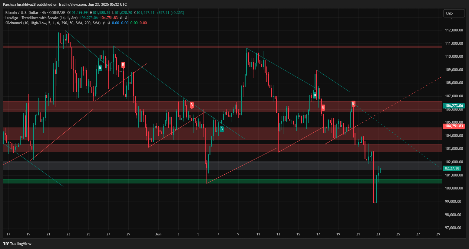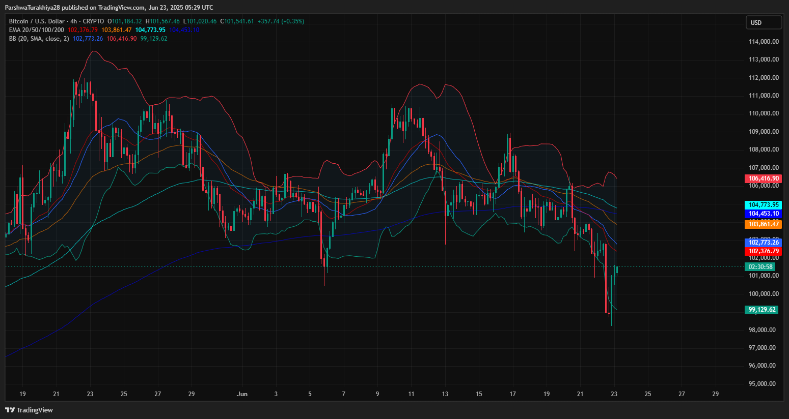 BTC盘中强势反弹,从98,600美元的低点回升至101,000美元上方,并在4小时图上形成看涨吞噬结构。这一走势恰逢比特币触及日线图上的布林带下轨和通道支撑位之际。