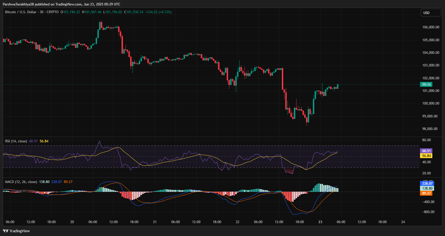 BTC 的强劲反弹似乎是受到短期超卖状况和 9.9 万美元附近技术支撑位的推动。MACD 柱状图自 6 月 20 日以来首次转为正值,RSI 指标重新收复 50 的关口。