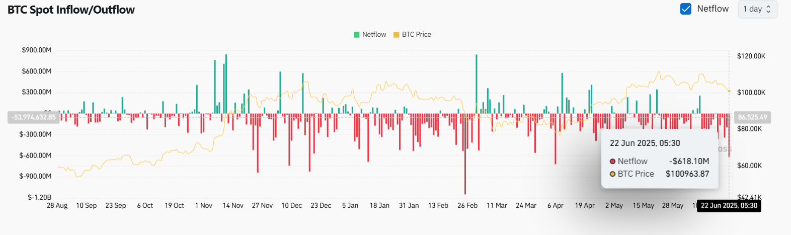 值得注意的是,尽管比特币价格出现反弹,但链上资金流依然严重看跌。最新数据显示,6月22日比特币净流入量为-6.181亿,表明现货交易所持续面临抛售压力。