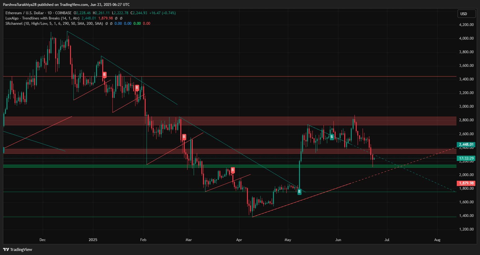 短期反弹尝试在先前上升楔形形态的下边界遭遇阻力。5月下旬出现的以太坊价格飙升已完全回吐,突破2,448美元的阻力位目前构成强劲阻力。除非ETH收于该区域上方并有成交量确认,否则上涨潜力仍然受限。