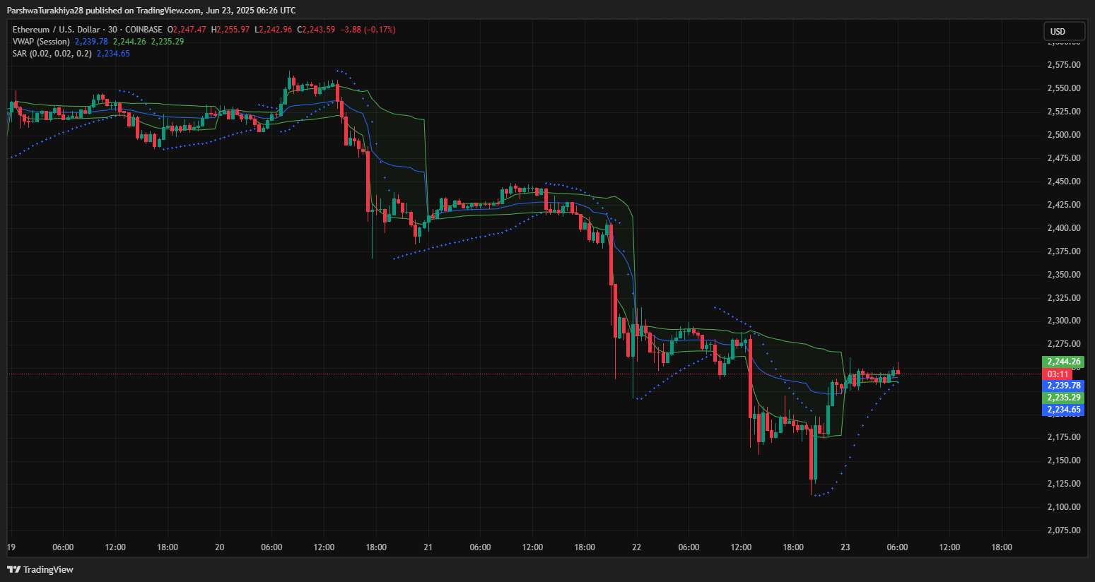 30分钟图显示,RSI在35附近触底,随后回升至55.55,略有背离。MACD交叉看涨,但仍然较浅,价格继续在成交量加权平均价(VWAP)和抛物线转向指标(SAR)2,234美元至2,244美元附近下跌,表明尽管出现反弹,但缺乏上涨动力。