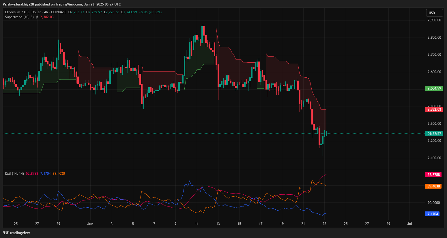 4小时图上,超级趋势指标(Supertrend)在2,382美元下方保持看跌,DMI(方向运动指数)显示-DI占主导地位,为52.87,而ADX攀升至39以上——表明市场呈现强劲的活跃趋势,利好卖方。牛熊力量(BBP)自6月17日以来也一直保持负值,证实了盘中普遍的疲软态势。