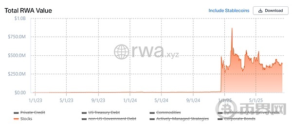 rwa.xyz 数据显示,今年以来,股票类代币化资产的规模已从几乎为零跃升至数亿美元,背后则是股票代币化正从概念加速走向落地——经历了从合成资产到实股托管的模式演进,并正向衍生品等更高阶形态延伸。