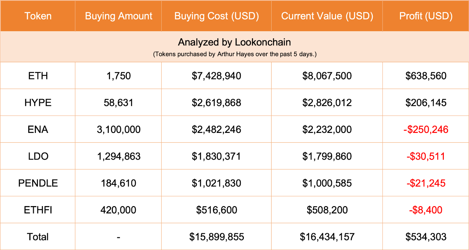 今天的买入是Hayes五天疯狂增持的一部分,在此期间,他以743万美元的价格买入了1750枚ETH。与此同时,随着以太坊的上涨,这部分持仓的价值已超过800万美元,净利润达到638,560美元。