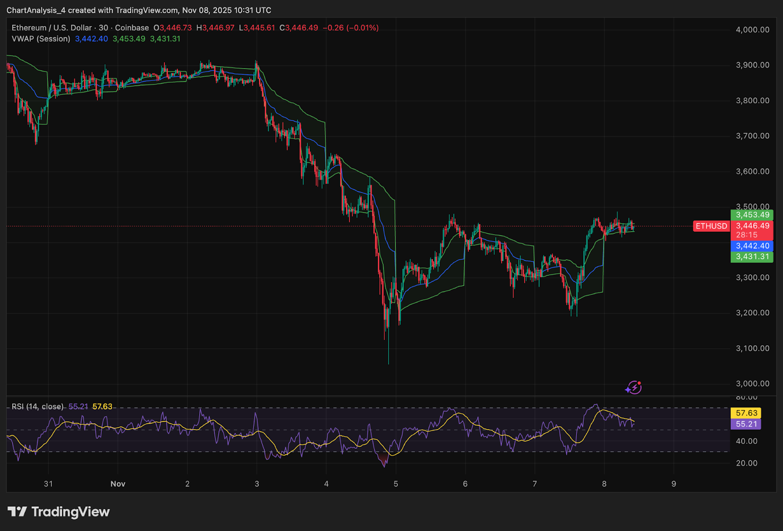 截至撰写本文时,以太坊该股目前交易价格为 3446 美元,正努力重回自 4 月以来构成更高低点的上升趋势线。近期跌破该趋势线意味着之前的趋势线支撑失效,暗示市场动能可能发生转变。