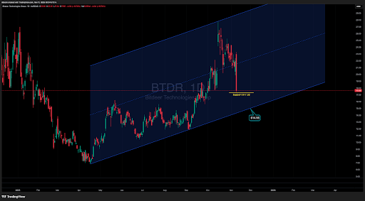 市场反应最初十分激烈,但技术分析显示,抛售压力在略高于……的水平找到了暂时的支撑。17.32美元支撑位。然而,BTDR真正的结构性防御根植于其长期技术形态。