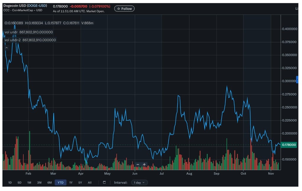 事实上,即使算上它自己的 ETF,狗狗币的表现也十分平淡——过去 30 天下跌了 6.1%,今年迄今为止下跌了 43.81%。