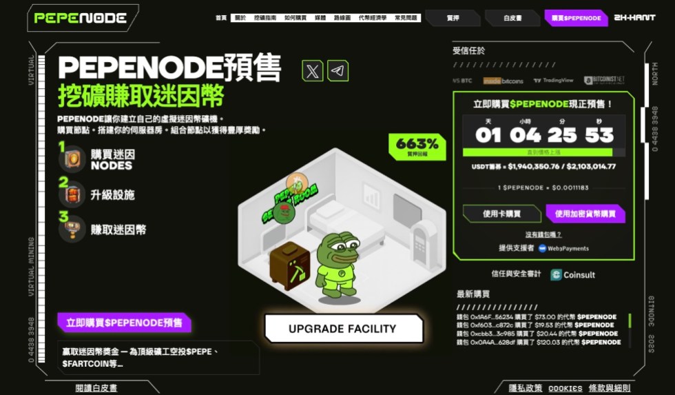 預售參與者可直接獲得該專案最高的收益階段,其預估年化報酬率高達611%,在迷因幣世界中屬於極高收益結構。早期參與者亦可取得更高等級的虛擬挖礦節點,進一步提升收益累積速度,使佩佩诺德在遊戲與收益兩個層面同時具強烈的吸引力。