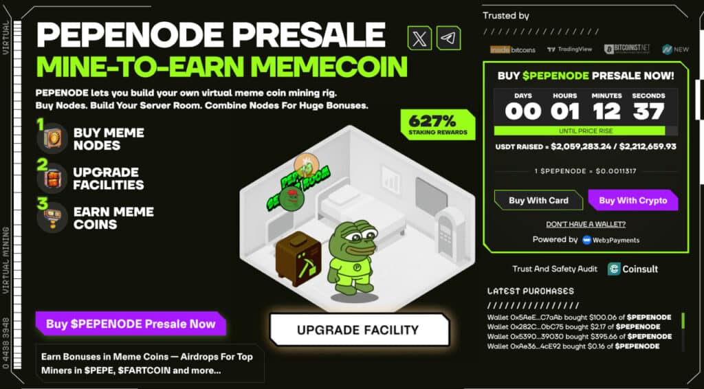 它感觉像是早期的比特币挖矿,但加入起来更容易,完全虚拟,面向所有人。PepeNode 已经筹集了超过 210 万美元,投资者可以使用 ETH、BNB、USDT 甚至信用卡进行投资。
