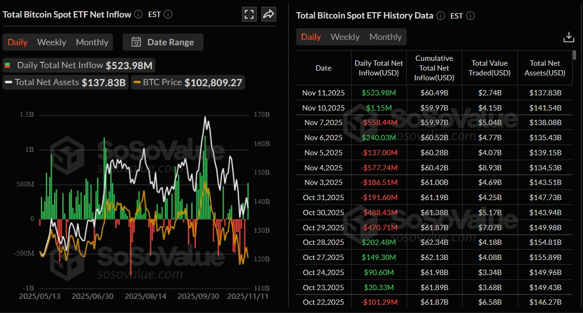 机构对比特币的需求出现了一些复苏迹象。根据SoSoValue的数据,周二在美国上市的现货比特币ETF录得5.2398亿美元的资金流入,而前一天的流入量仅为115万美元。结束了此前连续多周的提款潮,上周提款总额达12.2亿美元。如果这种资金流入趋势加剧,可能会为比特币延续其持续的价格复苏提供所需的动力。