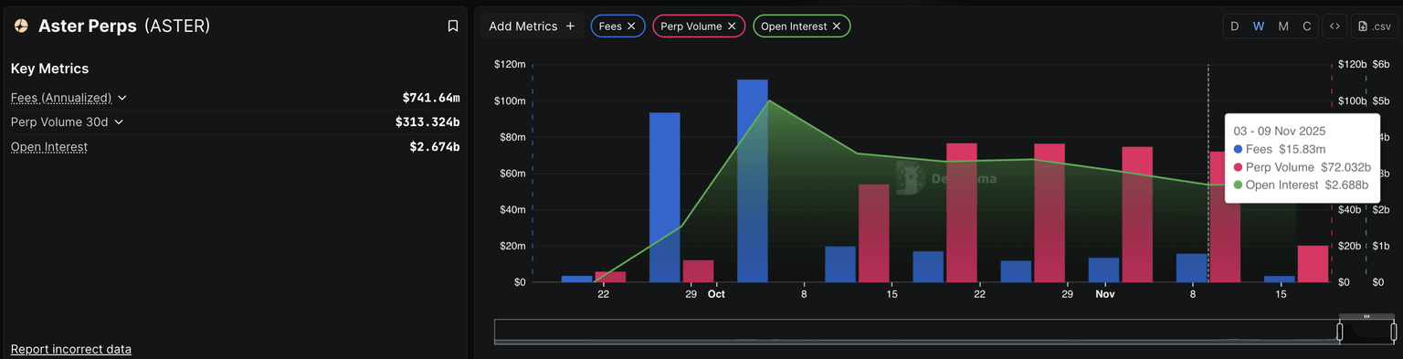 与此同时,Aster 的未平仓合约 (OI) 为 26.69 亿美元,低于 10 月 5 日的 50.11 亿美元。OI 代表平台上所有上市代币未平仓永续合约的名义价值。OI 的下降表明交易者避险情绪升温,这与币安支持的 Aster 平台收取的较低费用相符。DEX.