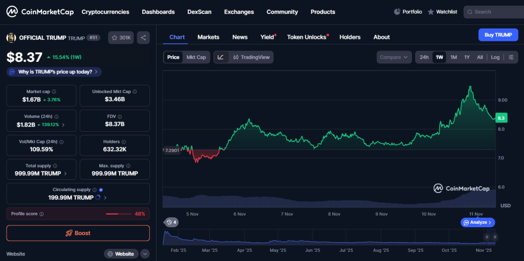 现在,专家们认为$TRUMP实际上是一个正在进行战略性举措的项目,因此它现在被列入了他们的名单。现在最值得购买的实用型加密货币至于$TRUMP的价格,受这些传闻影响,股价上涨,目前报8.37美元。这标志着……增长15.54%专家们认为,鉴于上周的价格走势以及新的潜在走势,这轮上涨行情还将继续。