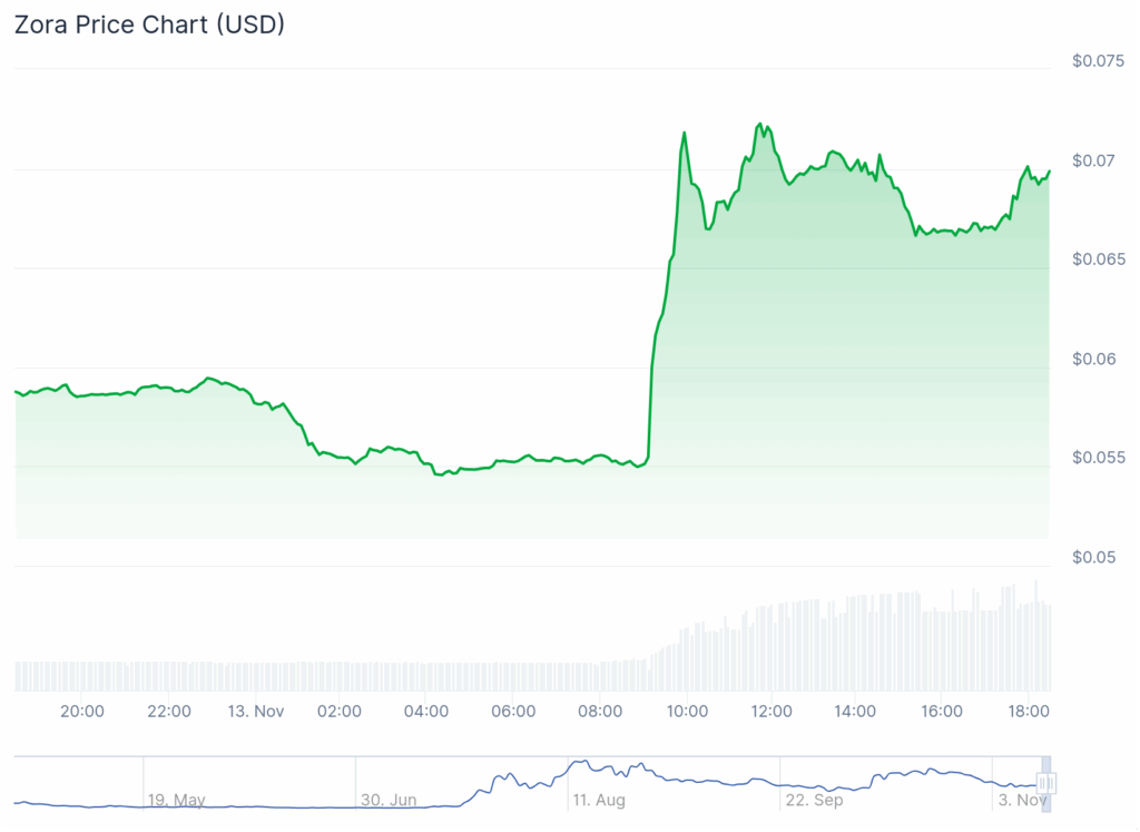 尽管 Zora 的上涨势头在 0.072 美元处受阻,但如果收盘价高于该价位,则可能引发一波强劲的上涨,目标价位为 0.09 美元,这是其在 10 月份下跌之前上一轮上涨的上限价位。