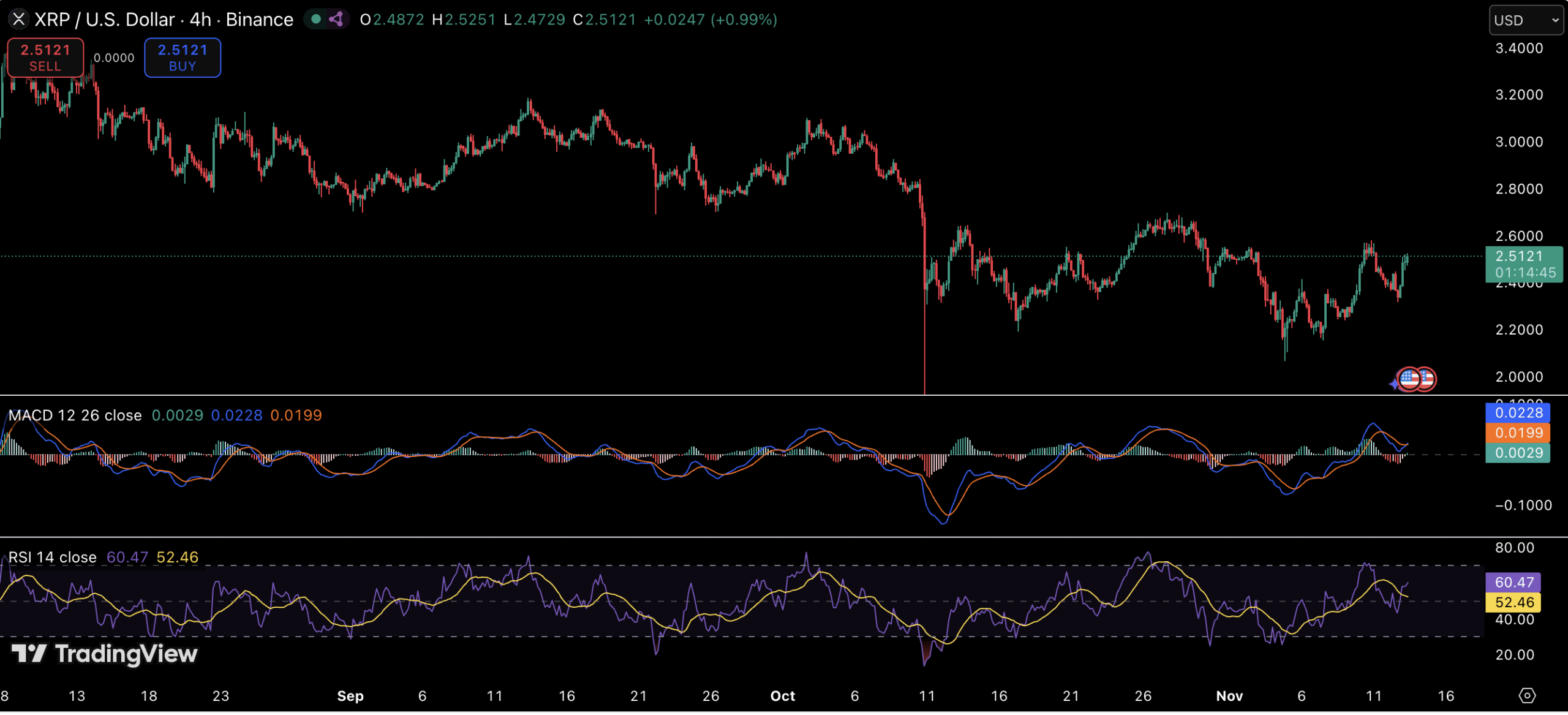 从技术层面来看,XRP 目前价格接近 2.50 美元,略低于 2.88 美元的下降楔形突破位。分析师认为,如果未来几周 ETF 资金流入保持稳定,XRP 若能顺利收于该区域上方,则有望冲击 5 美元。