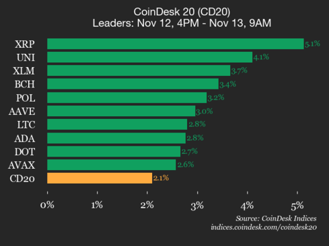 CoinDesk 指数发布每日市场动态,重点介绍市场领先者和落后者的表现。CoinDesk 20 指数.