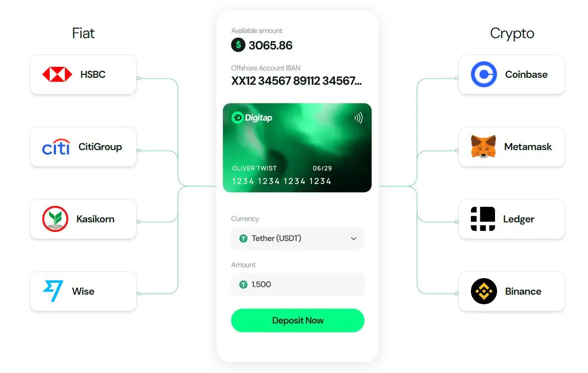 Digitap打造了全球首家全能银行,这是一款能够无缝连接加密货币的统一金融应用程序。菲亚特