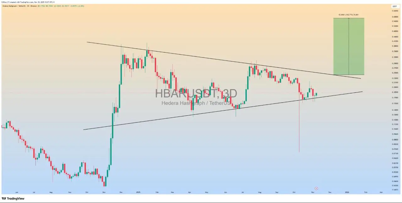 此外,11月中旬HBAR的交易价格约为0.18美元。本周涨幅5.7%技术分析师克利夫顿FX还发现 HBAR 三日图表中形成了一个对称三角形形态。
