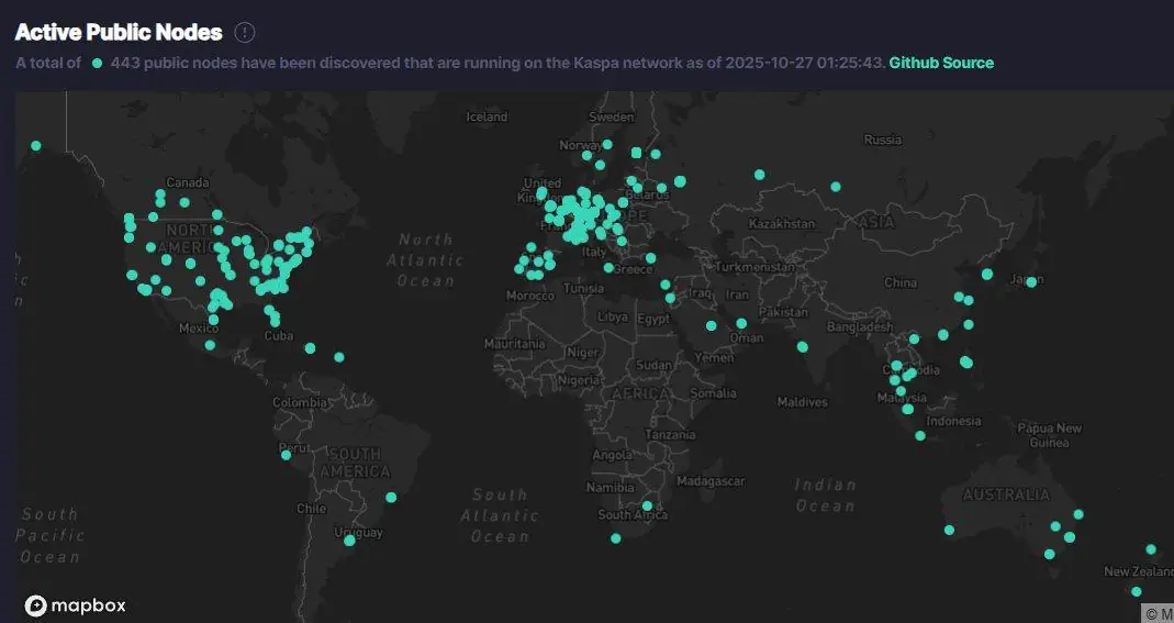 Kaspa活跃节点数量创纪录地达到443个,进一步加强了去中心化。