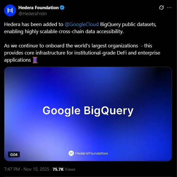 2025年11月10日,Hedera Hashgraph 正式加入Google BigQuery 的公共区块链数据集与 Ariane Labs 和 Hashgraph 的工程师合作,开发者现在可以像查询比特币和以太坊一样查询 Hedera 的完整交易历史记录。