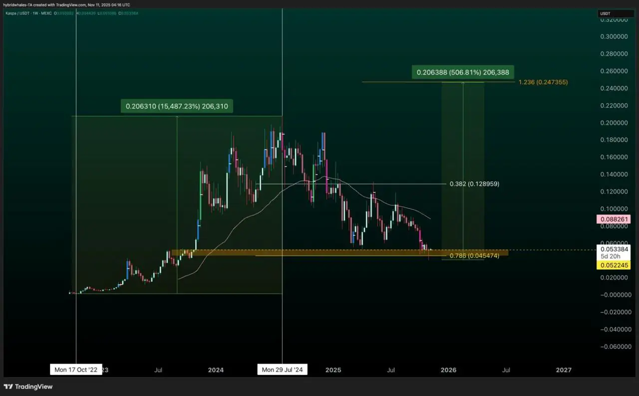 KAS的价格走势也十分强劲。增长超过13%过去一周,该股股价在0.05美元左右波动。此外,一位分析师称……卡斯帕的底部KAS 现已完全回落至 0.786 斐波那契水平。