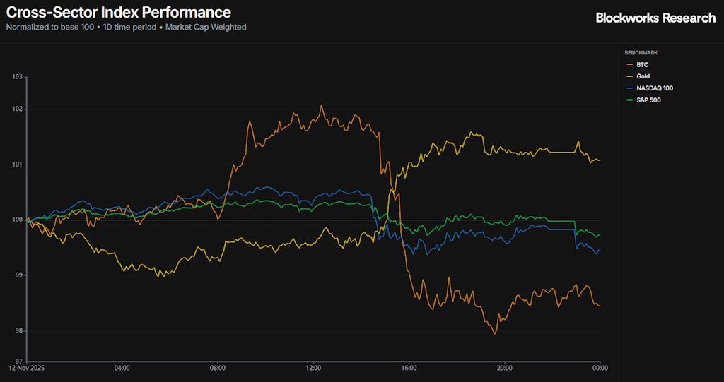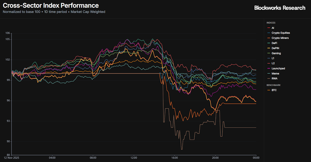 表现落后的板块包括加密货币矿工和风险加权资产(RWA),分别下跌4.44%和7.94%。人工智能相关股票的回调蔓延至矿业股,其中许多矿业股已转向人工智能数据中心。年初至今,该板块累计上涨105.5%,因此出现一些获利回吐也在意料之中。