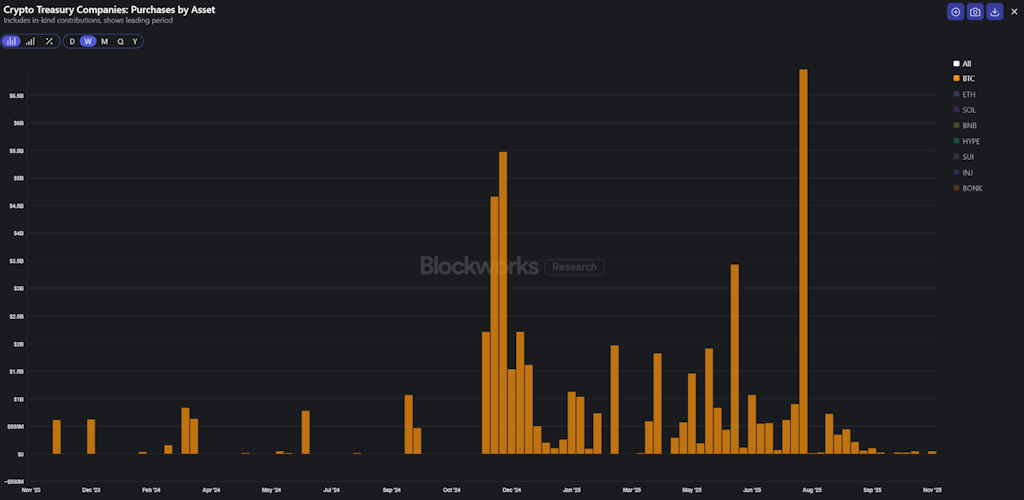 这种怀疑情绪已在数据中有所体现。财政机构购买比特币的步伐已大幅放缓,从每隔几周就动辄数十亿美元的巨额购买,降至近期每周2500万至5000万美元的较为温和的购买量。