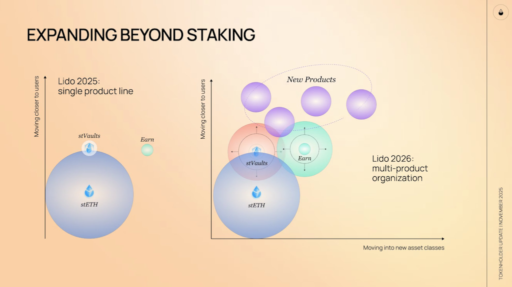 这为超越质押的扩展奠定了基础,Lido 将从 2025 年的单一产品 stETH 协议发展成为 2026 年的多产品组织。Lido 的 stVaults 将成为机构质押和收益策略的可配置平台,Earn 也将随之扩展。简易“默认让路”前门对于零售和交易所而言,随着 Lido 越来越贴近用户(分销)并向新的资产类别迈进,一个新的结构化和自动化产品层级占据了顶端。