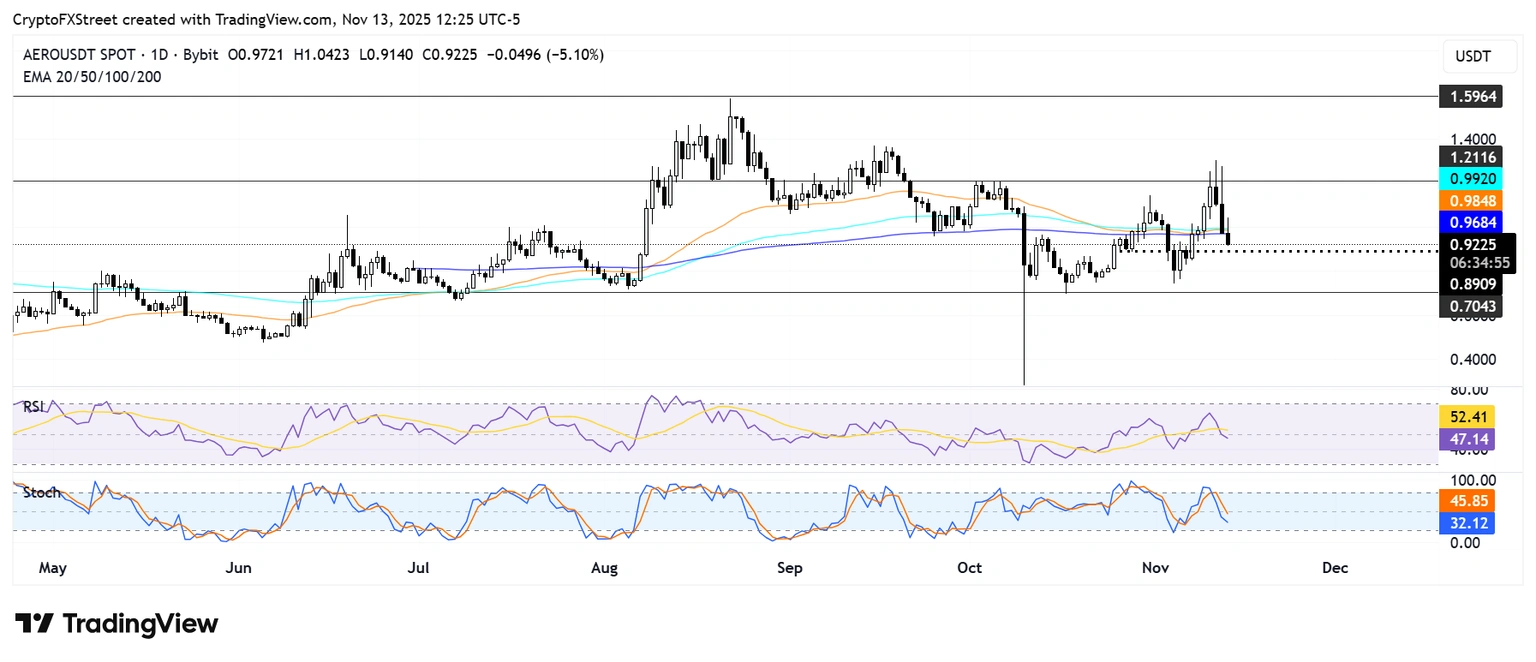AERO 正在接近 0.90 美元附近的短期支撑位,该支撑位是其在 10 月 26 日至 28 日期间反弹的心理关口。如果未能守住该支撑位,其价格可能下探至 0.70 美元的关键水平。上行方面,AERO 必须突破 EMA 指数的交汇点才能重新测试 1.21 美元的阻力位。