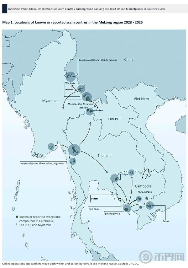 2023-2025年湄公河地区已知或已报告诈骗中心分布