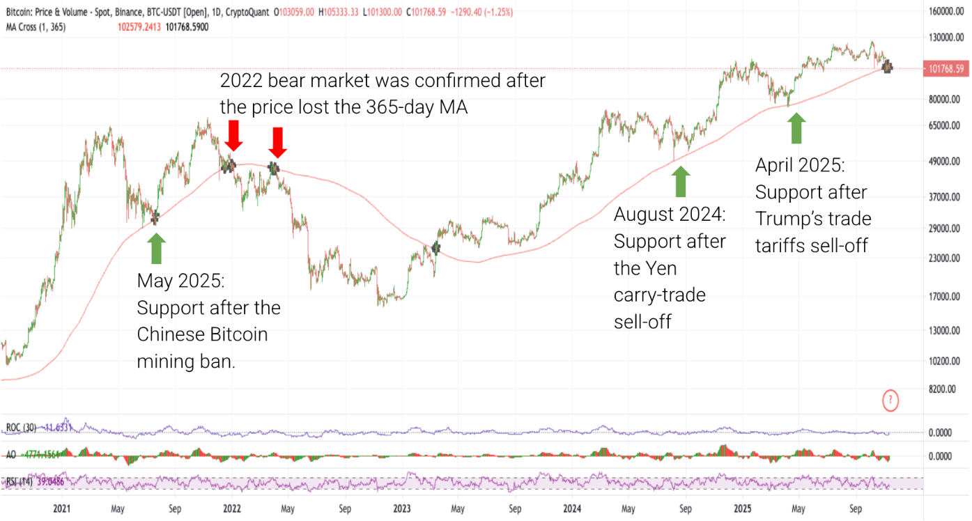 报告总结指出,365日移动平均线(MA)位于102,000美元附近,是需要关注的关键技术和心理支撑位。该支撑位在本轮牛市中一直发挥着重要作用(下图绿色箭头所示),并且是2021年12月至2022年1月熊市开始时触发的最后几个信号之一。如果未能重新站上365日移动平均线,可能会加速更深层次的回调。值得注意的是,比特币在本轮牛市中多次收于365日移动平均线下方,这在本轮牛市中尚属首次。如果抛售压力足够大,下一个价格支撑位将是位于91,000美元的2倍梅特卡夫网络价值区间。交易者的最低价格区间为 72,000 美元.
