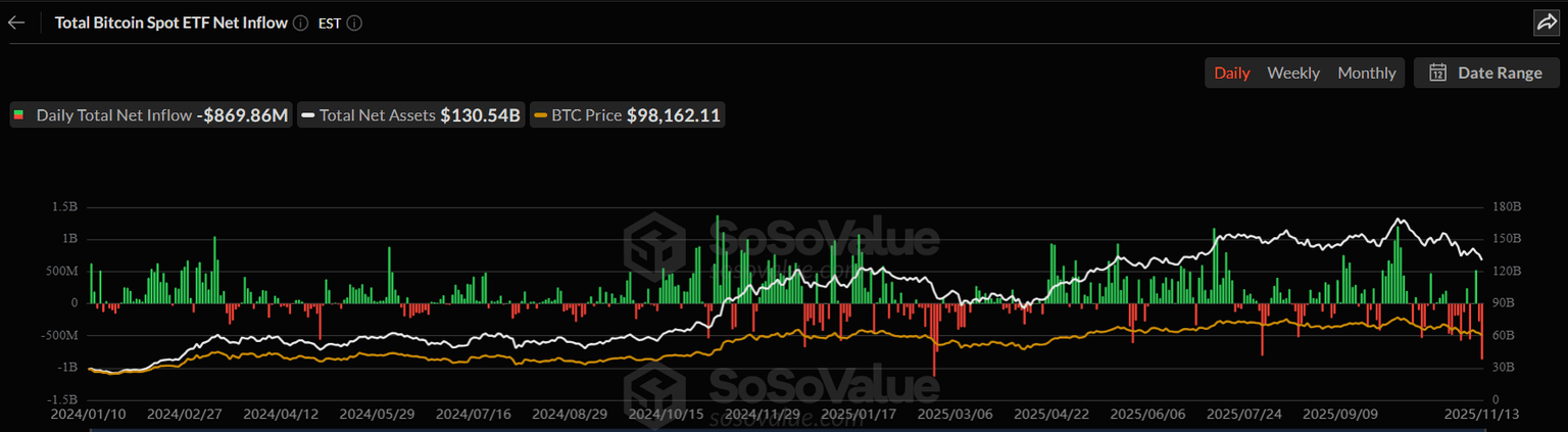 随着投降阶段的逐渐形成,比特币(BTC)市场结构持续恶化。上周五,BTC价格跌破97,000美元,本周迄今跌幅已超过7%。机构需求持续疲软,截至周四,现货比特币交易所交易基金(ETF)资金流出高达6.227亿美元,连续第三周出现资金流出。